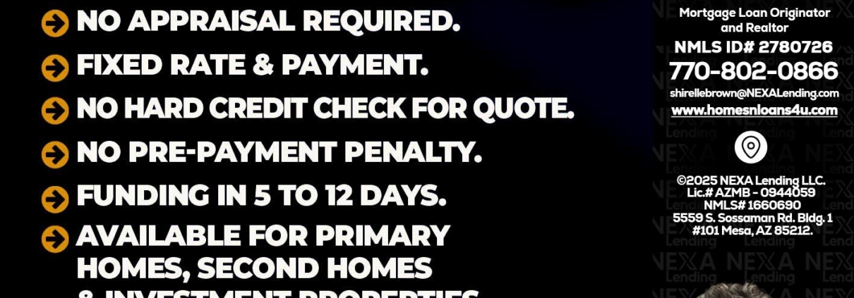 Hi, my name is Shirelle Brown. I’m a Loan Officer with NEXA Lending LLC., offering personalized mortgage solutions, fast customized quotes, great rates and service with integrity.
